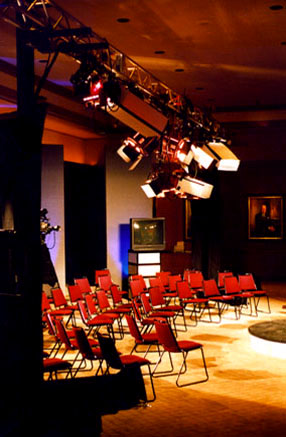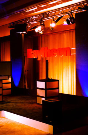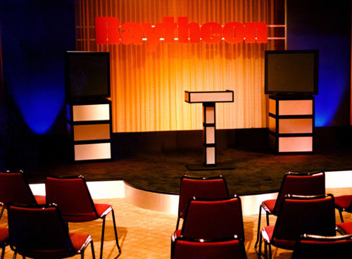 Corporate CommunicationsLarge scale corporate communications, for clients such as Raytheon (pictured left) and Hewlett Packard (pictured below), is our specialty. For this satellite cast of Raytheon's annual employee forum, to over 600 remote sites world wide, from their corporate headquarters in Lexington, Ma., we employed over 40 lighting instruments (most dimmed on 24/2.4 channels) rigged on 60' of overhead truss supported by four Genie Lift Towers and powered by our 450 Amp Generator. |
